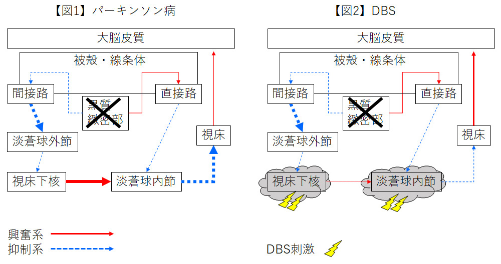 パーキンソン病では中脳黒質の脱落で、黒質からの被殻の興奮系(直接路)が減少し、被殻から淡蒼球内節への抑制系が低下する。さらに黒質から被殻の抑制系(間接路)が減少し、被殻から淡蒼球外節への抑制系が増加し淡蒼球外節が抑制され、淡蒼球外節から視床下核への抑制が減少するために、視床下核の活動が高まる。過活動な視床下核から淡蒼球内節へ刺激が増加する。以上より、淡蒼球内節では直接路の抑制が減り、間接路の刺激が増加して、淡蒼球内節の活動が高まる。その結果、淡蒼球内節から視床への抑制系が強くなって、視床から大脳皮質への刺激が減少するために、パーキンソン病の運動障害が発生するとされる。