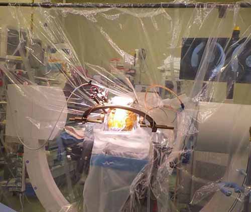 術中ではレントゲン透視を行い、電極を挿入している。