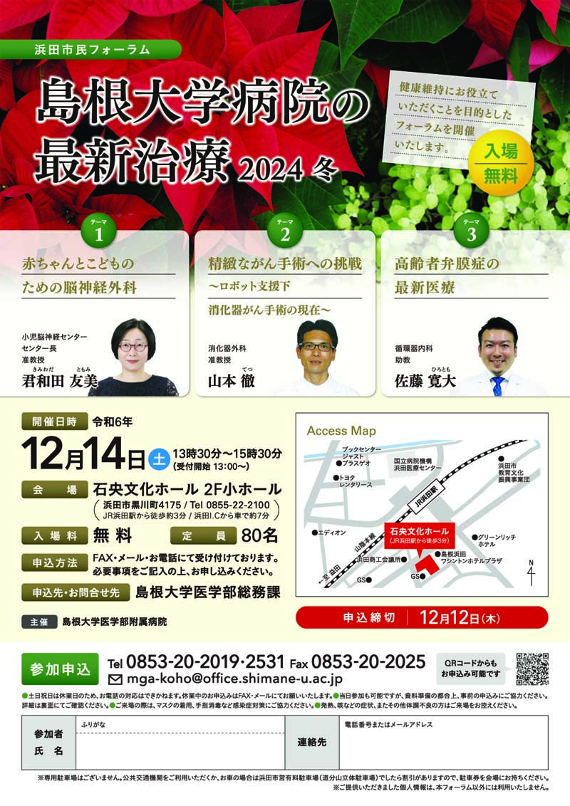 「島根大学病院の最新治療 2024冬」(令和6年12月14日 浜田市)で当講座スタッフ(小児脳神経疾患治療センター准教授)君和田友美先生が講演致します。