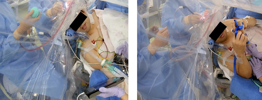 覚醒下手術は,文字通り、手術の途中で患者さんの麻酔を覚まして行う手術です。麻酔から覚めて、意識のはっきりした状態の患者さんと会話をしながら手術を行うことで、言語や脳高次機能、そして細かな手指の運動機能も確認しながら手術を遂行でき、神経機能の温存を第一に考えた治療を行うことができます。覚醒下手術は、高度な麻酔管理、術中看護、臨床工学士、言語聴覚士など多様な医療スタッフで構成されるチームで実施します。
