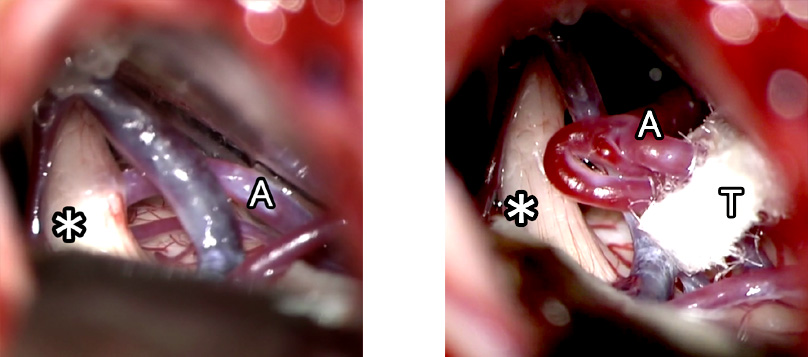 A:血管 *:三叉神経 T:テープ