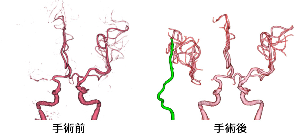 当院では一度の手術でできる限り脳血流が増えることを期待して皮膚の血管を2本切離し、その2本を脳の表面の血管につなげるようにしております。状況によって1本の方が安全と判断された場合にはその限りではなく、患者さん個々の病状にあったオーダーメイドの治療を心掛けております。